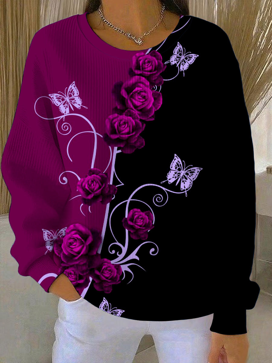 Dámské ohromující fialová růže a motýl tisk barevná bloková mikina