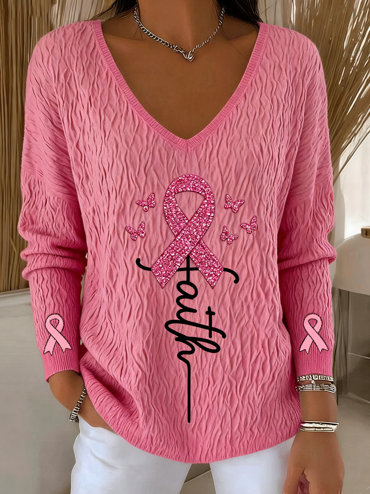 Retro rakovina prsu diamant faith print svetr s dlouhým rukávem